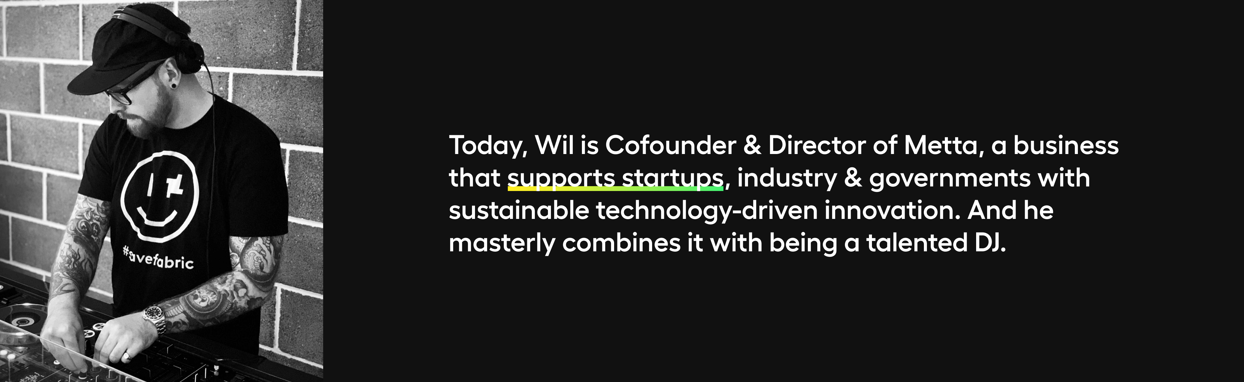 Wil: Thanks! I'm co-founder and director at Metta. We facilitate transformative innovation as a force for good with startups, industry, and governments. I'm also an active angel investor (~35 investments to date), Venture Partner at Aerospace Xelerated, The Boeing Company's global startup accelerator program, and I run a few record labels in my spare time.