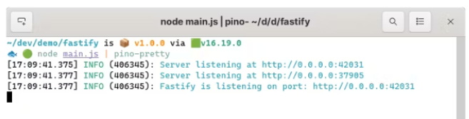 {"level":30,"time":1675958171940,"pid":391638,"hostname":"fedora","msg":"Fastify is listening on port: http://127.0.0.1:3000"}