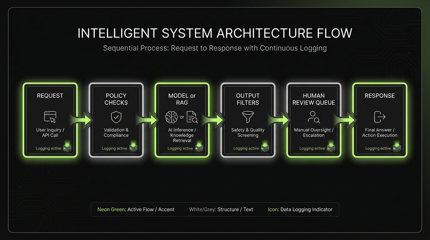 - Policy gate before model call (PII rules, disallowed intents)