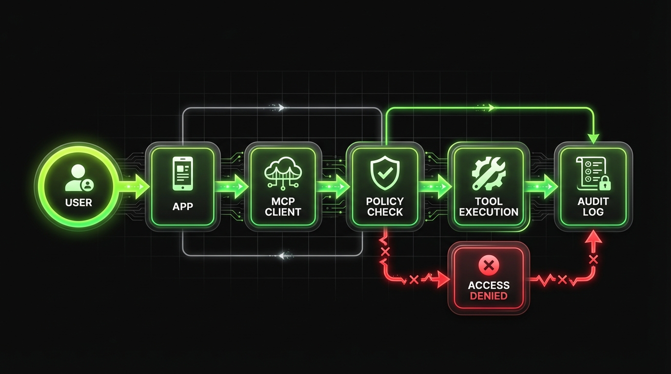 Every tool call maps to a user or service principal for auditability.