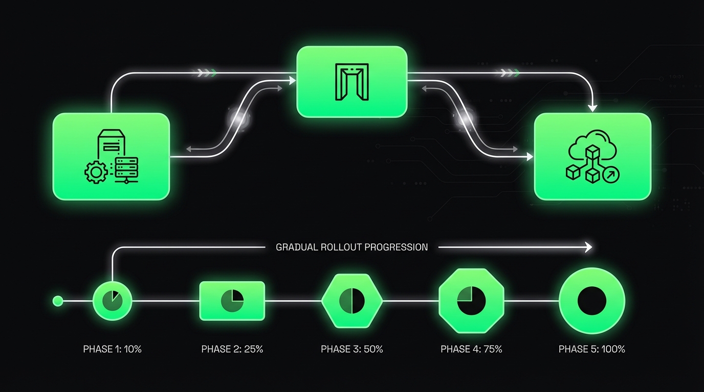 - Gradual cutover. Route 1%, then 10%, then 50%, then 100%.