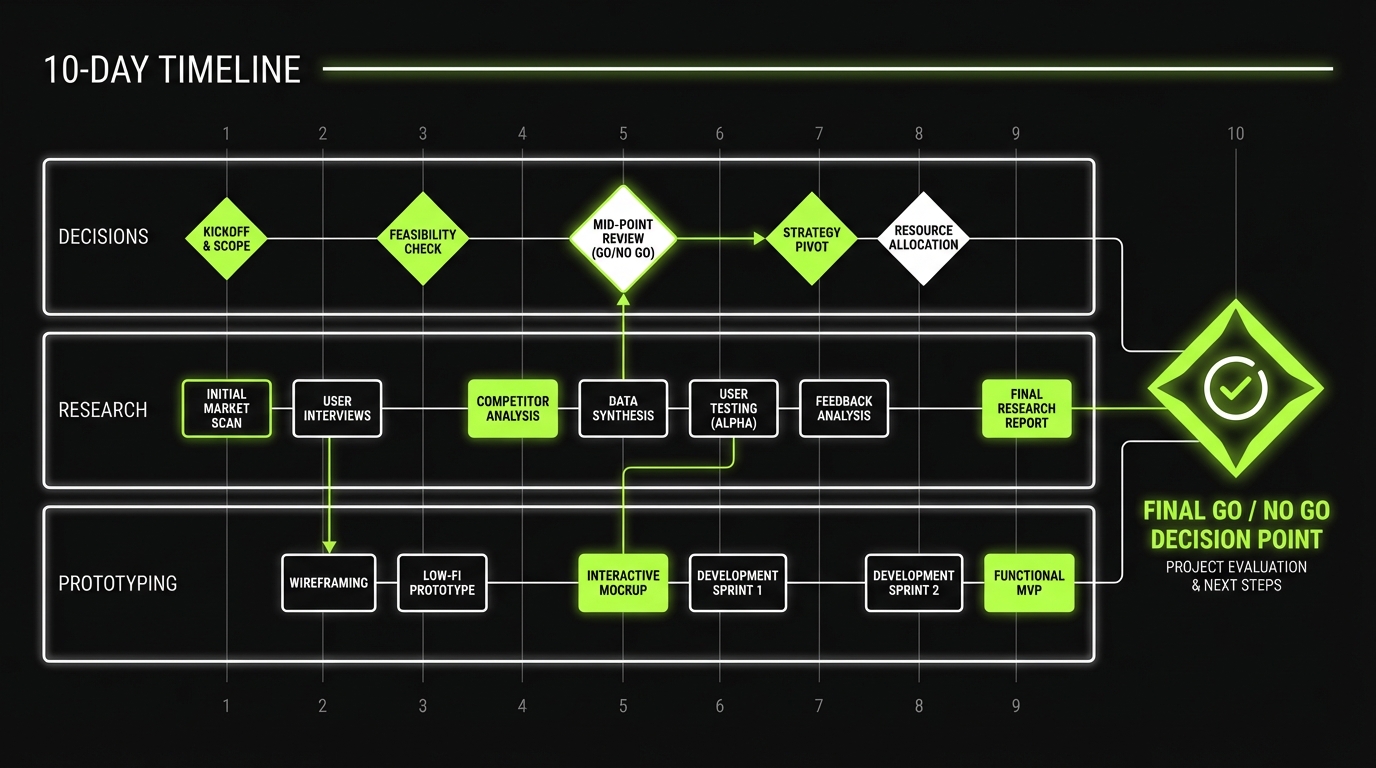 A discovery sprint should be short, opinionated, and output driven. Below is a structure we use when the goal is fast validation and a build ready plan.