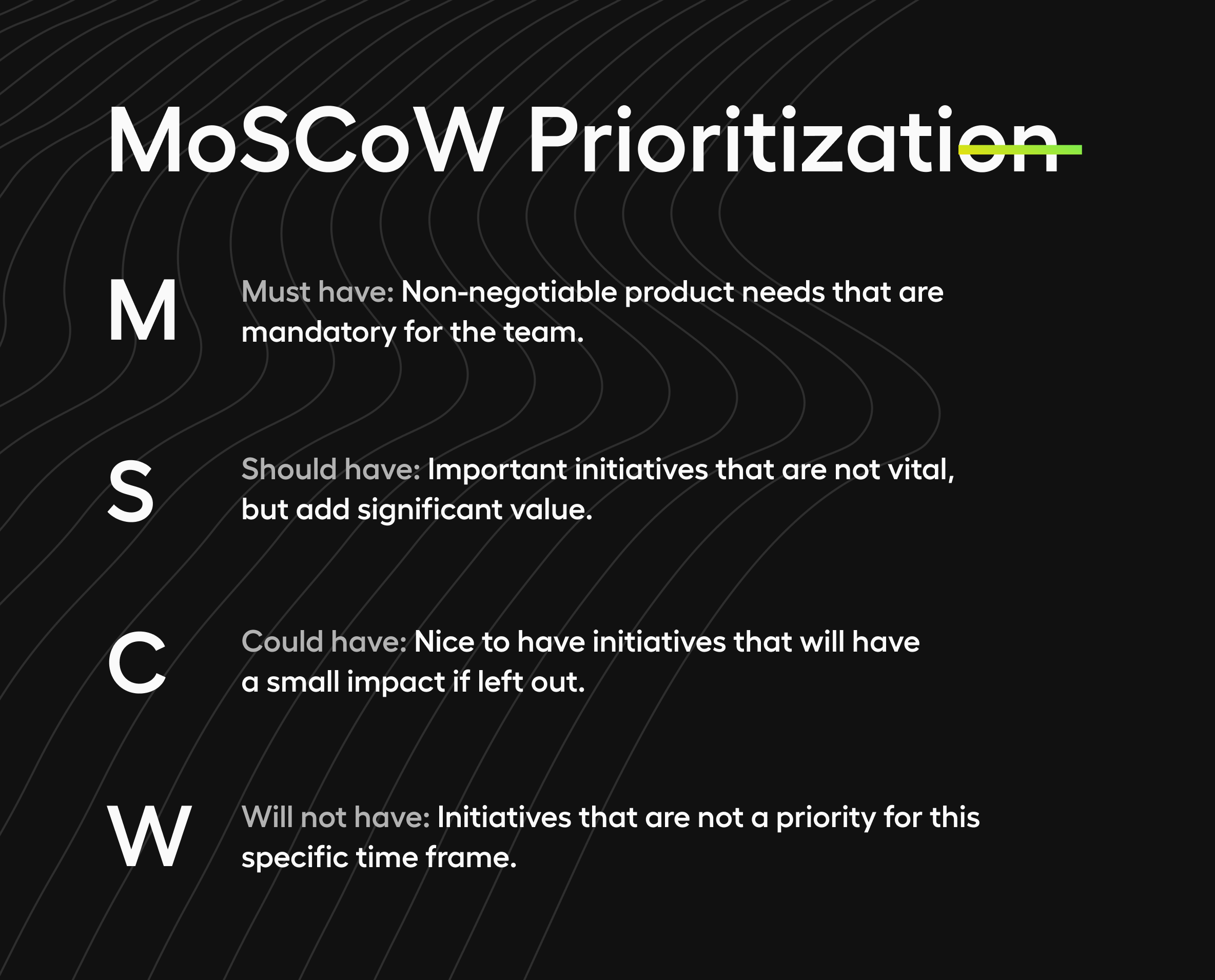 - In the MoSCoW technique, you put items into four categories: Must have, Should have, Could have, Won't have right now. The must-have category, for instance, is for Epics that the product wouldn't work without. The should-have items add considerable value, but you can imagine the product without them. At this point in the process, you're not likely to have Epics on your list that are totally unnecessary, but this technique should help you to identify the essential elements. The recommended proportion of must-haves to should-haves to could-haves is 60/20/20.