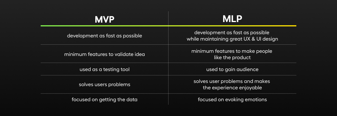 - MLP (Minimum Lovable Product), on the other hand, is an extension of this concept. Its idea is not to provide only those functionalities that will meet the audience needs, but also to make the users enjoy it and, in an ideal scenario, to make them love it right away. Thus, in this concept, it is also worth focusing on design and UX, because an accessible interface and a nice look are colossal in a world of fast and visual stimuli.
