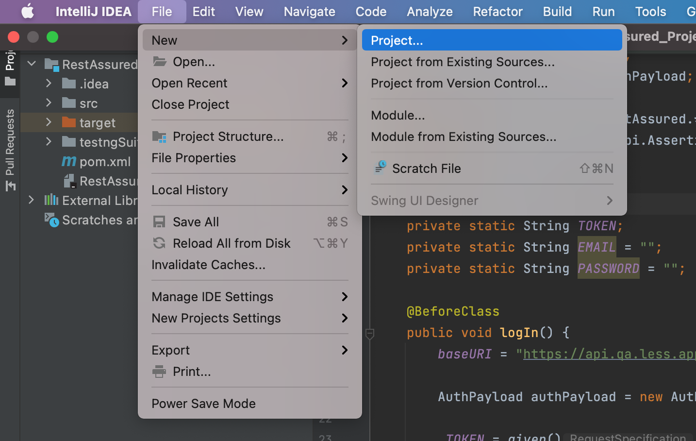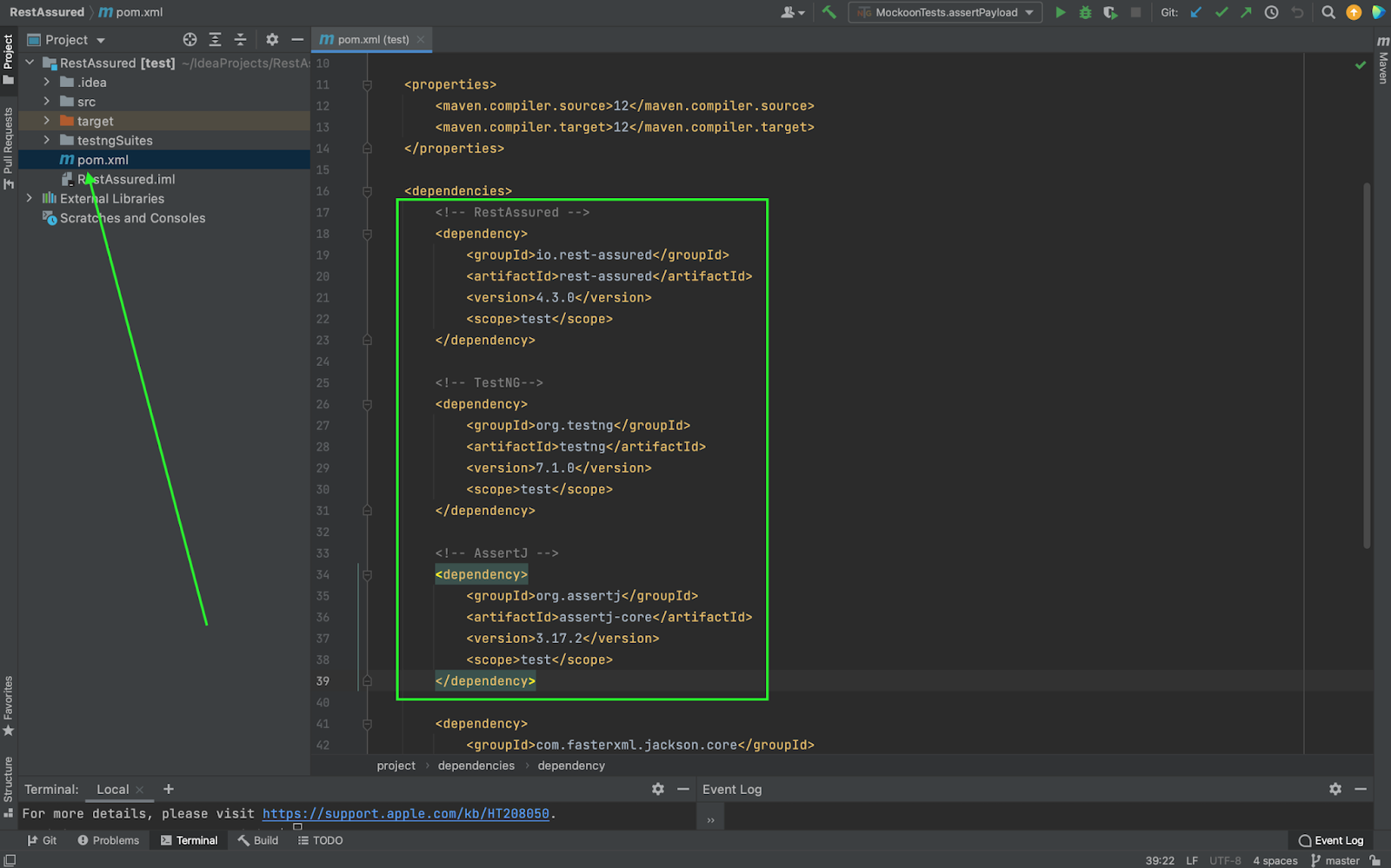 Adding the dependency to the pom.xml file - these are the entries which plugins are to be “installed” to our project. In our case, we need RestAssured, TestNG and AssertJ: