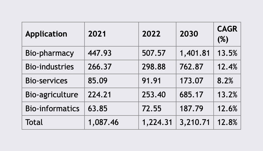 As we witness these breathtaking advancements in AI, it's impossible to overlook the incredible strides in another potent field: Biotechnology. With applications spanning bio-informatics, bio-services, bio-agriculture, bio-industries, and bio-pharmacy, Biotech is experiencing an unprecedented boom. Particularly, bio-informatics is projected to surge at an impressive CAGR of 12.6% between 2022 and 2030.