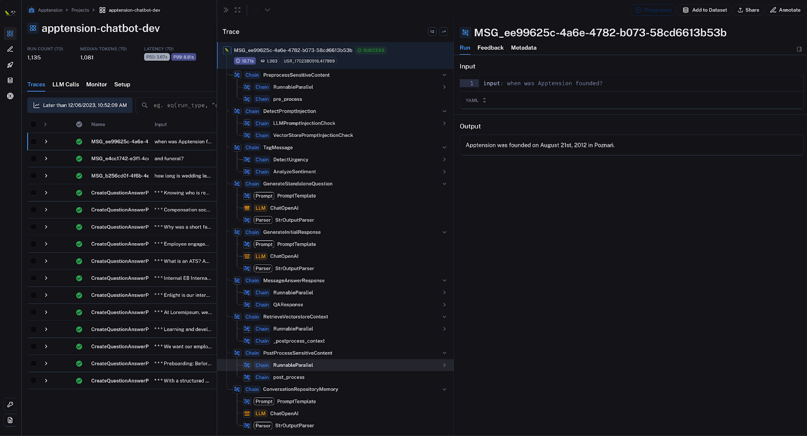 export LANGCHAIN_PROJECT="my-first-langsmith-run"The interface allows you to monitor your entire application execution process, providing essential metrics such as token usage and latency and broken down into each single subprocess.