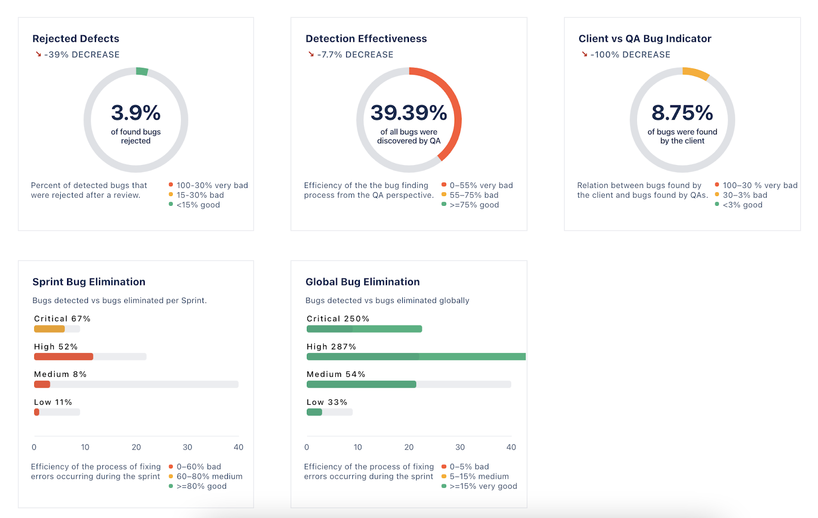 - the number of project errors and their trends, plus the priorities with their weight in % (to evaluate the quality and precision of documentation)