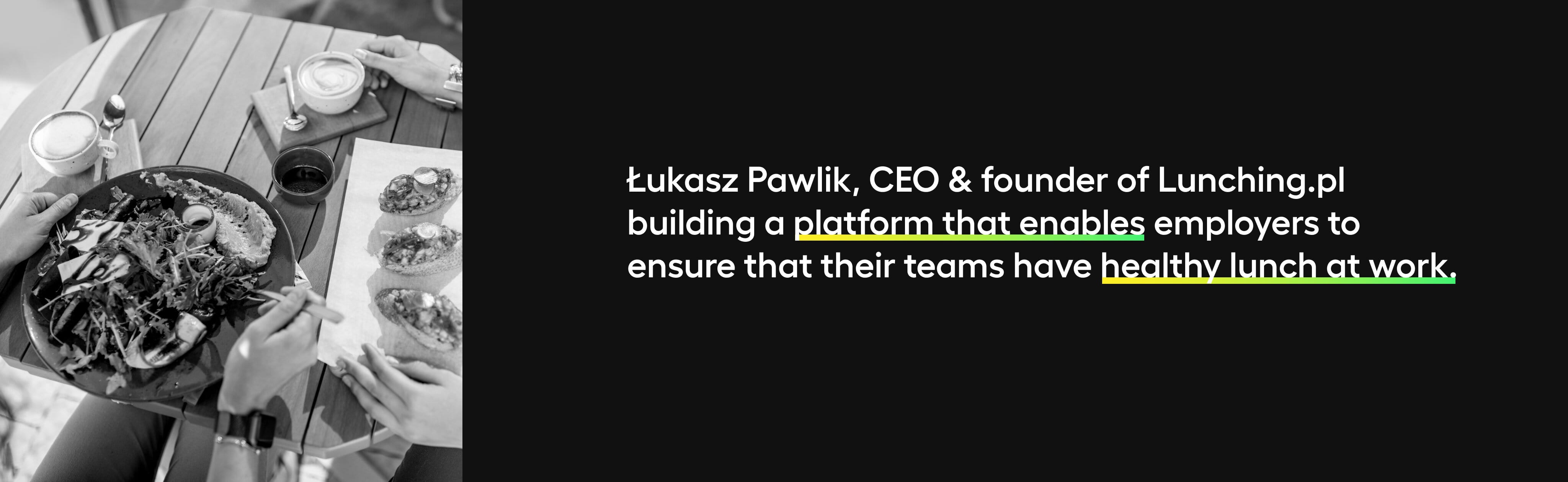 Łukasz Pawlik is a CEO and founder of lunching.pl. Lunching.pl subsides one of the crucial, daily-used employee benefits - warm and healthy work meals. And recently, they sold part of their startup to a company called the Benefits Systems, one of the biggest companies in Poland providing employee benefits.